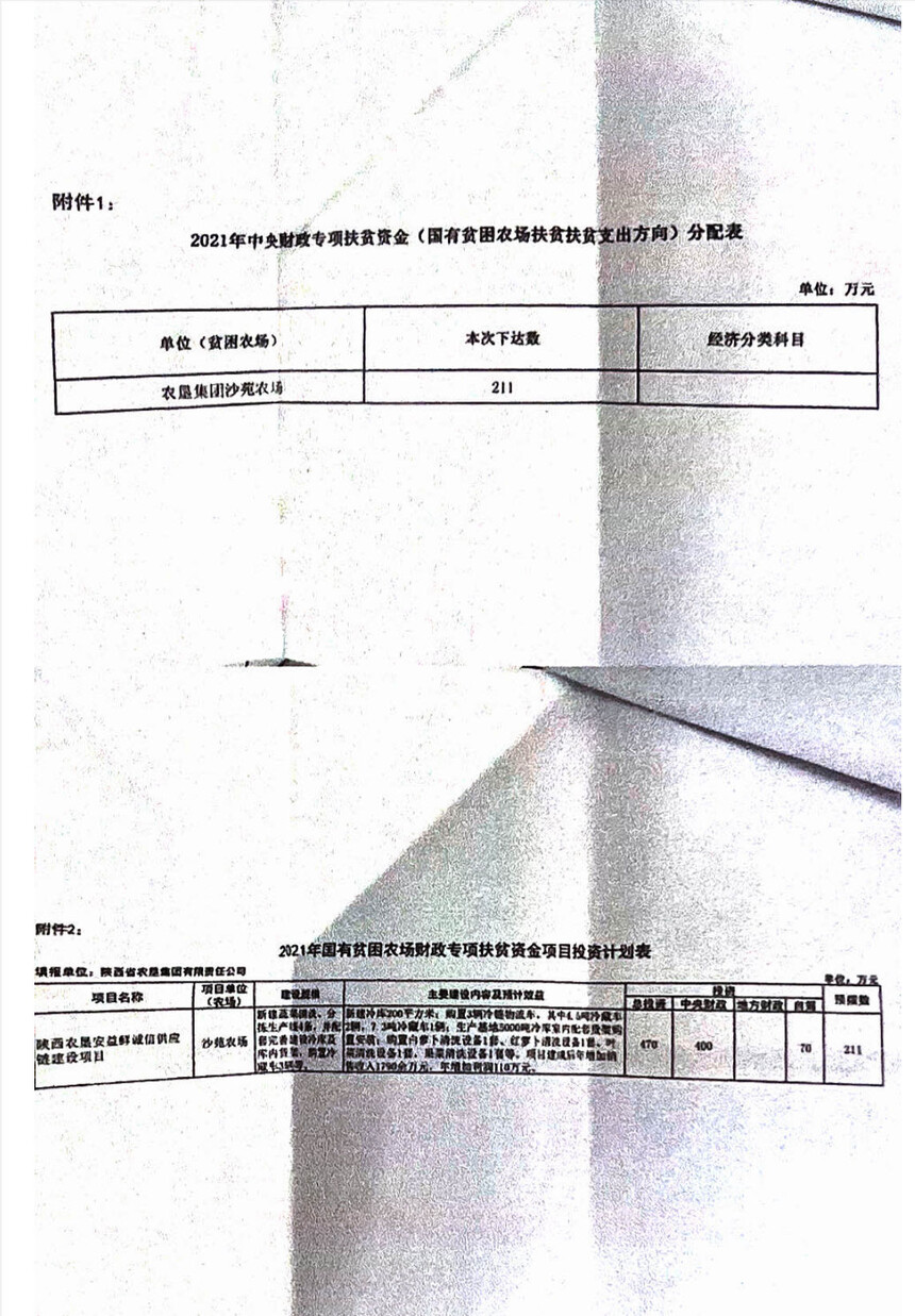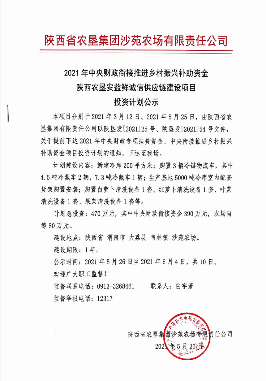 2021年中央財政銜接推進鄉村振興補助資金陜西農墾安益鮮誠信供應鏈建設項目投資計劃公示