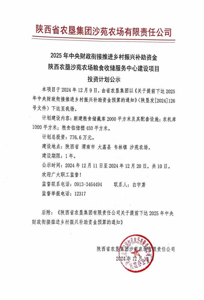 2025年中央財(cái)政銜接推進(jìn)鄉(xiāng)村振興補(bǔ)助資金 陜西農(nóng)墾沙苑農(nóng)場糧食收儲服務(wù)中心建設(shè)項(xiàng)目投資計(jì)劃公示时间:2024-12-11 【原创】