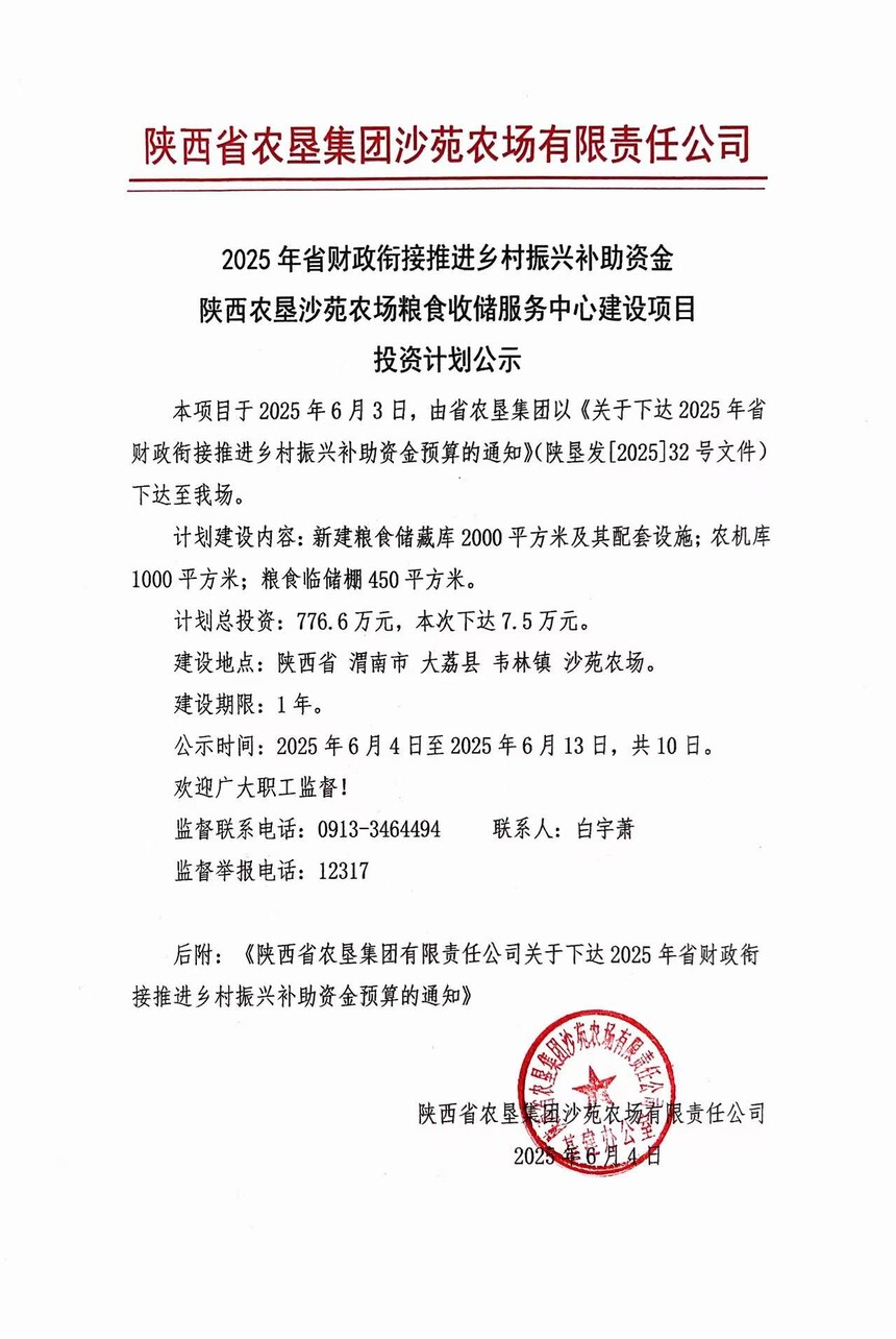 2025年省財政銜接推進鄉村振興補助資金 陜西農墾沙苑農場糧食收儲服務中心建設項目投資計劃公示