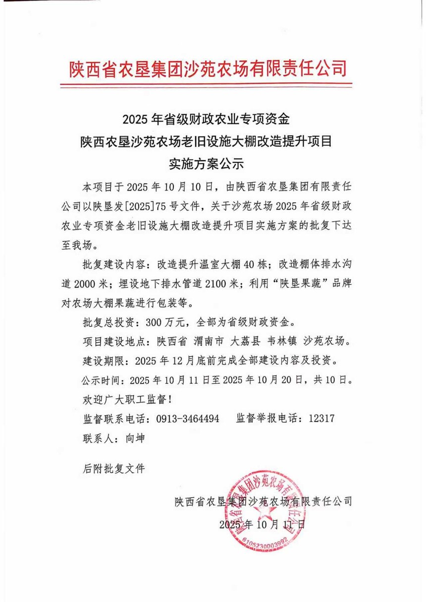2025年省級(jí)財(cái)政農(nóng)業(yè)專(zhuān)項(xiàng)資金陜西農(nóng)墾沙苑農(nóng)場(chǎng)老舊設(shè)施大棚改造提升項(xiàng)目實(shí)施方案公示时间:2025-10-11 【原创】